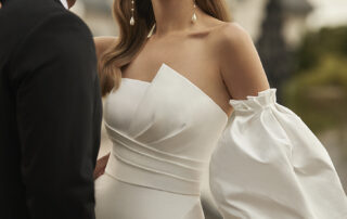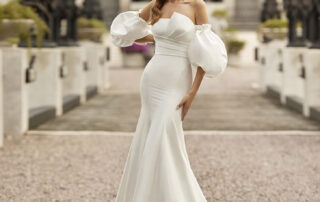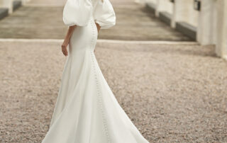 Découvrez la sublime robe de mariée « Estella » de la collection Rosa Clará. Cette robe sirène en mikado élégante est conçue pour mettre en valeur la silhouette féminine tout en apportant une touche de modernité et de sophistication.