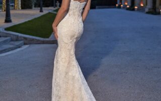 Confectionnée dans une dentelle délicate brodée de motifs floraux, la robe épouse parfaitement les courbes avant de s’évaser dans une jupe sirène raffinée. Le corset transparent à baleines, subtilement sexy, assure maintien et structure tout en mettant en valeur la taille.