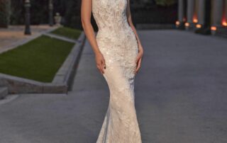 Découvrez Geramy, une robe de mariée spectaculaire qui incarne le glamour et l’élégance à l’état pur. Conçue pour sublimer la silhouette, Geramy se distingue par sa coupe sirène sophistiquée et son corset bustier structuré aux détails floraux.