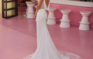 Sa coupe sirène près du corps sublime la silhouette et se prolonge par une somptueuse traîne bordée de dentelle florale transparente, qui apporte une note romantique et délicate.
