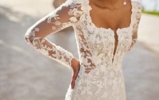 Le corsage, sublimé par un décolleté carré tendance et des incrustations de dentelle florale, respire la délicatesse et le romantisme. Les manches longues amovibles en tulle illusion brodé permettent de transformer le look : sophistiqué et majestueux pour la cérémonie, puis plus épuré et sensuel pour la soirée.