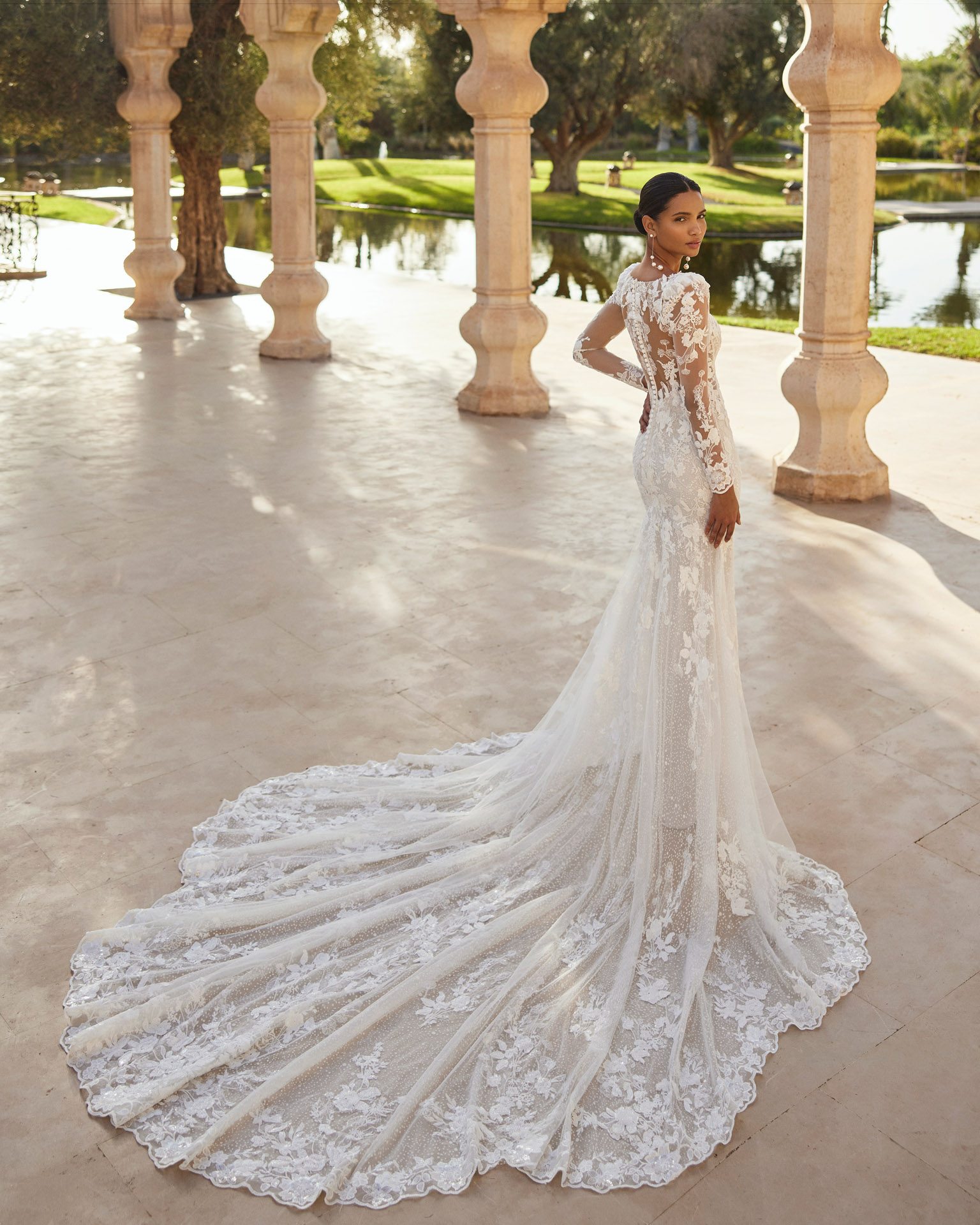 Le corsage, sublimé par un décolleté carré tendance et des incrustations de dentelle florale, respire la délicatesse et le romantisme. Les manches longues amovibles en tulle illusion brodé permettent de transformer le look : sophistiqué et majestueux pour la cérémonie, puis plus épuré et sensuel pour la soirée.
