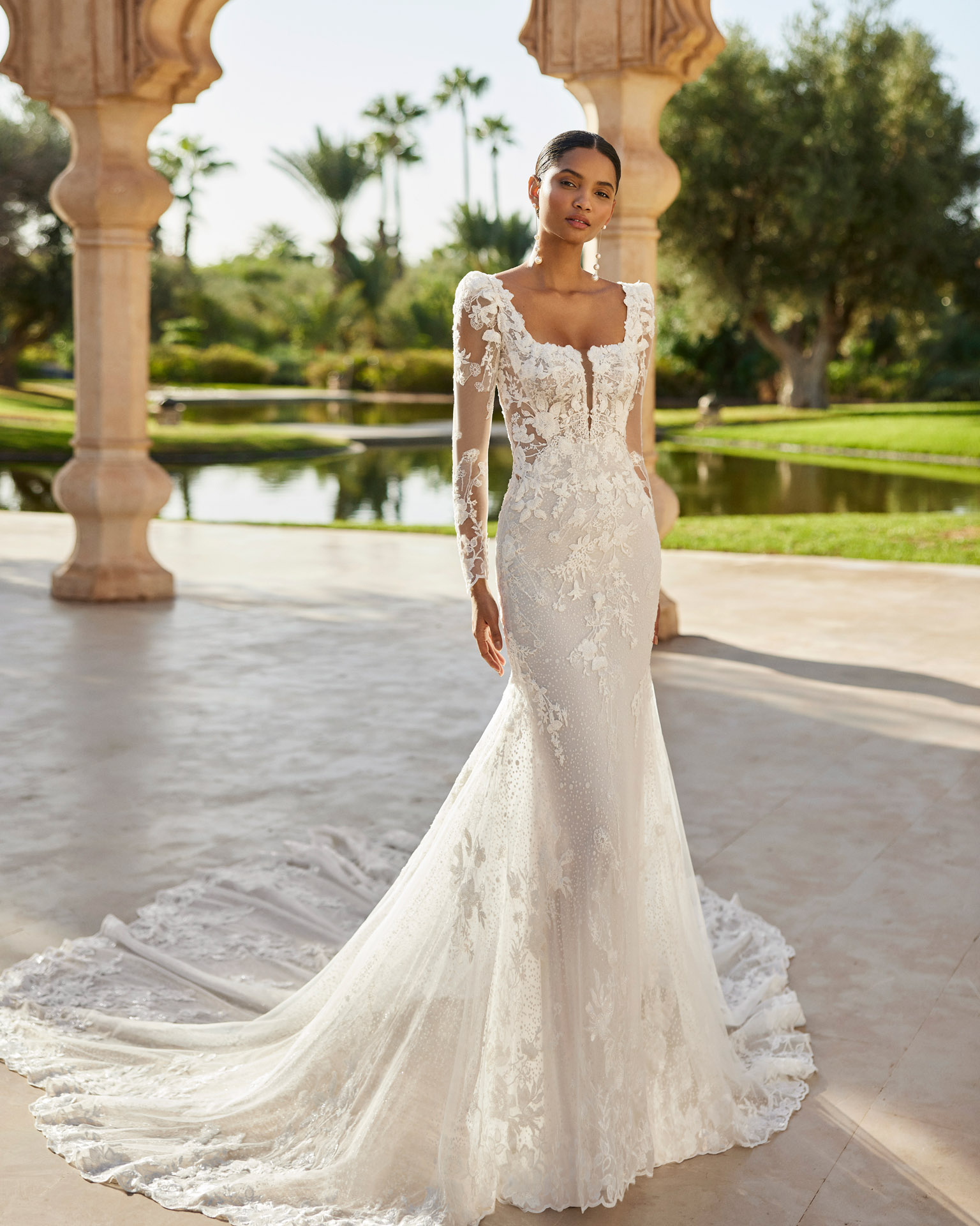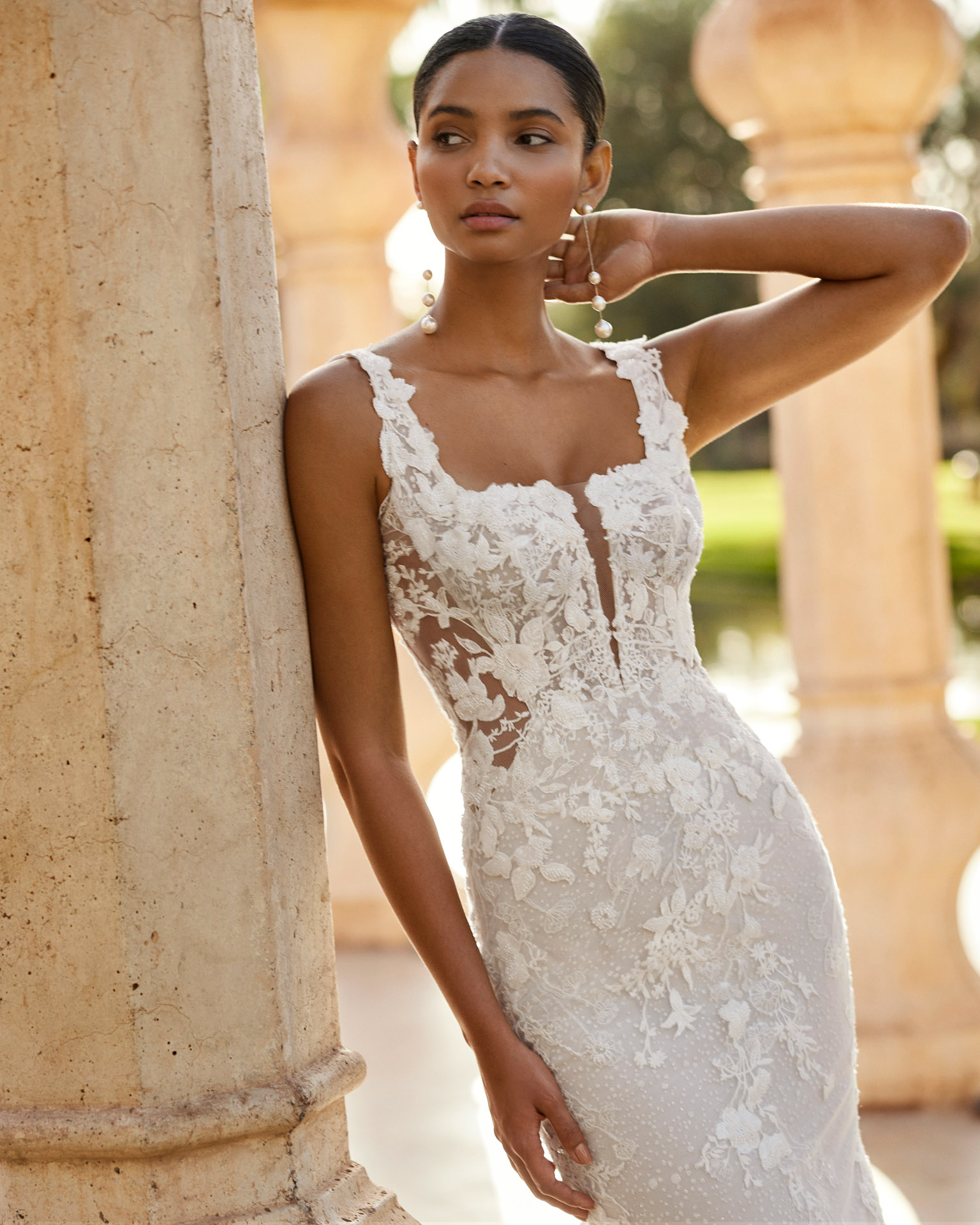 La robe Olesa de Rosa Clará est une pièce d’exception pour la mariée moderne et raffinée. Sa coupe sirène près du corps épouse la silhouette avec élégance et féminité, mettant en valeur chaque courbe de façon harmonieuse.