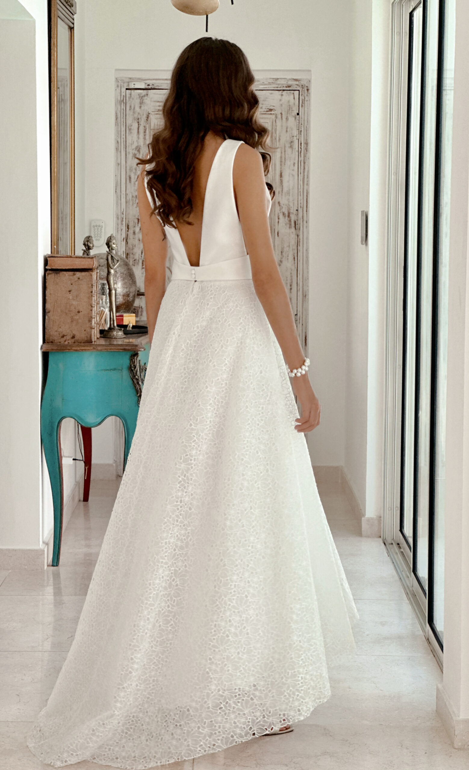 Cette robe de mariée mi-longue, création de Fabienne Alagama, incarne une élégance intemporelle et une sophistication discrète. Sa conception, entièrement fabriquée en France, garantit une qualité et un savoir-faire exceptionnels. Le choix de la dentelle anglaise pour la jupe confère à la robe une légèreté et une finesse aérienne. La coupe, avec son décolleté en V plongeant et son dos nu subtilement mis en valeur, est à la fois moderne et classique. Elle s’adapte parfaitement à la fois au cadre formel d’une cérémonie religieuse et à la simplicité d’un mariage civil. Le haut en mikado, structuré et élégant, contraste joliment avec la fluidité de la jupe en dentelle.